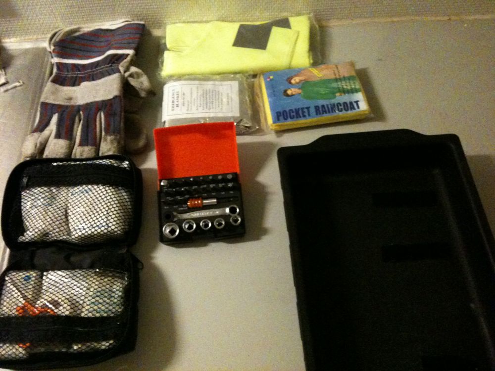 Beskrivelse: Nu har jeg endelig fundet på noget jeg kunne bruge skuffen under sædet til smilie det er et nøglesæt, førstehjælp taske og hansker samt tæppe.